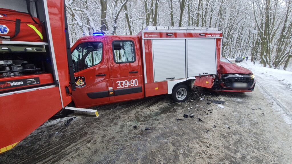 Zastępy OSP Wielka Wieś, po dojeździe na miejsce pierwotnego zdarzenia, realizowały standardowe czynności zabezpieczające teren akcji oraz uczestników kolizji. W trakcie prowadzonych działań kierujący samochodem osobowym marki Audi, poruszając się po śliskiej nawierzchni i nie dostosowując prędkości do warunków panujących na drodze, nie zdołał wyhamować i uderzył w tył lekkiego samochodu ratowniczo-gaśniczego Renault. W wyniku siły uderzenia pojazd ten został przemieszczony i najechał na tył średniego samochodu ratowniczo-gaśniczego ustawionego przed nim.