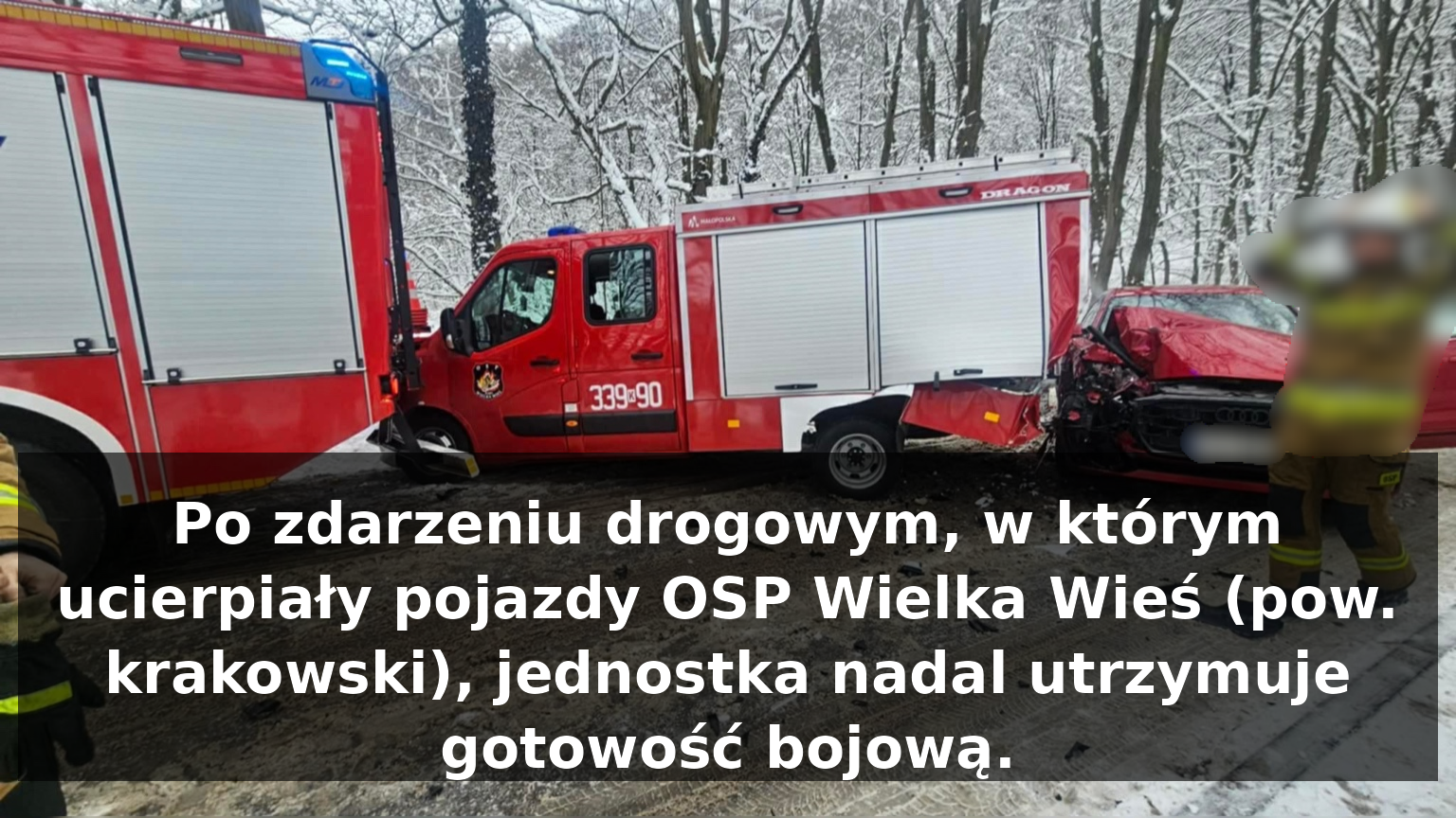Zastępy OSP Wielka Wieś, po dojeździe na miejsce pierwotnego zdarzenia, realizowały standardowe czynności zabezpieczające teren akcji oraz uczestników kolizji. W trakcie prowadzonych działań kierujący samochodem osobowym marki Audi, poruszając się po śliskiej nawierzchni i nie dostosowując prędkości do warunków panujących na drodze, nie zdołał wyhamować i uderzył w tył lekkiego samochodu ratowniczo-gaśniczego Renault. W wyniku siły uderzenia pojazd ten został przemieszczony i najechał na tył średniego samochodu ratowniczo-gaśniczego ustawionego przed nim.